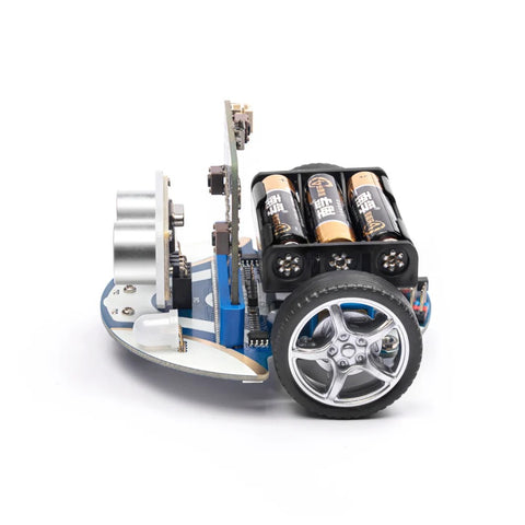 ELECFREAKS microbit Robot Smart Cutebot is a rear-wheel drive smart car powered by two high-speed motors. Cutebot has a lot of built-in equipment, such as an ultrasonic sensor and a distance sensor, two RGB LED projectors and position lights on the underside, two line tracking sensors, and an active buzzer as a horn. It has rich graphical programming for Cutebot that will help kids learn programming from simple to complex.