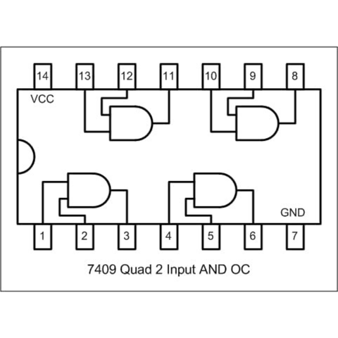 The 7409 is a TTL logic IC that integrates four independent 2-input AND gates with open-collector outputs in a single package.