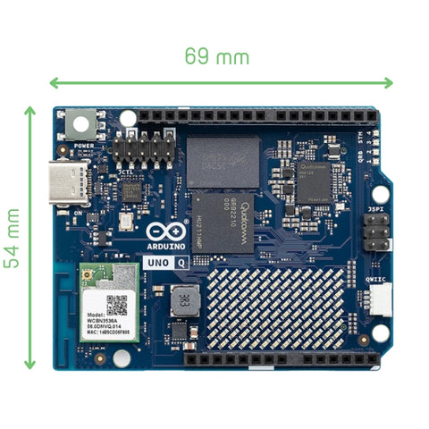 The Arduino UNO Q is a hybrid development board designed for advanced embedded and edge computing applications. It combines the Qualcomm Dragonwing QRB2210 microprocessor, running Debian Linux on a quad-core 2.0 GHz CPU with 2 GB RAM and 16 GB eMMC storage, with a real-time STM32U585 microcontroller for deterministic hardware control. This dual-architecture design enables high-level processing alongside low-latency, real-time operations. Integrated Wi-Fi 5 and Bluetooth 5.1 support reliable wireless connectivity. The board maintains compatibility with the Arduino UNO ecosystem and is suitable for robotics, data acquisition, computer vision, and industrial IoT development.